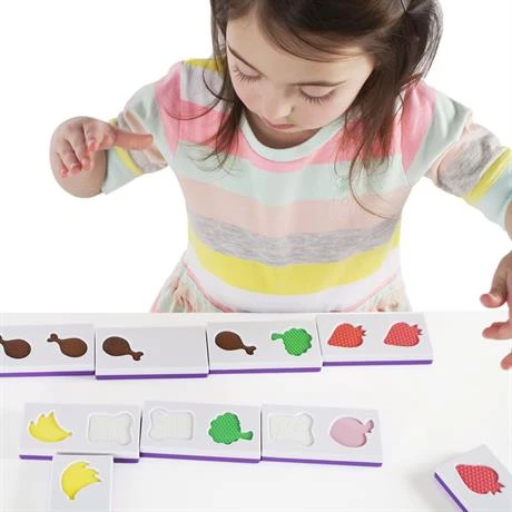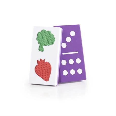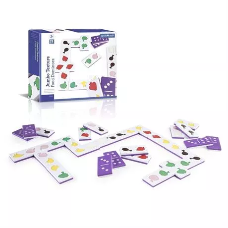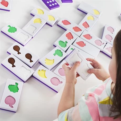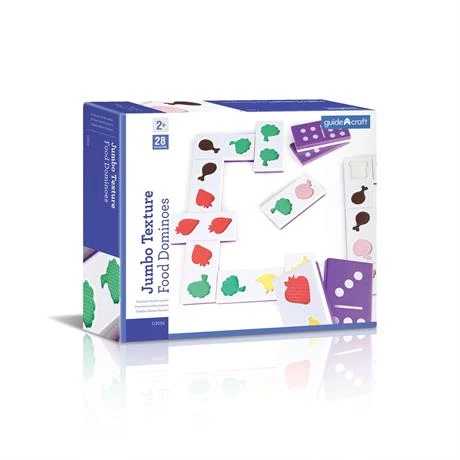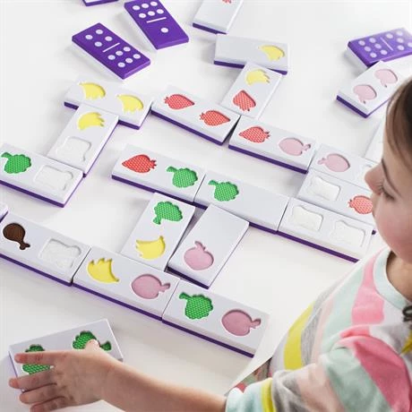 Великі деталі доміно це відмінний спосіб допомогти дітям розвинути тактильні відчуття і зорове сприйняття. З одного боку точки, а з іншого обриси продуктів з різними текстурами: курячі ніжки, скибочки хліба, банани, полуниця, брокколі і персики.