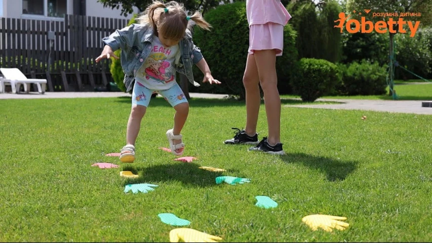 Набір включає 2 килимки, виконаних у вигляді долоньок. Вироби виконані зі спеціального прогумованого матеріалу. Поверхня з масажним ефектом позитивно впливає на кровообіг та стимулює нервові закінчення. Ігрові елементи можна розкласти на підлозі, зменшуючи чи збільшуючи відстань між ними.
