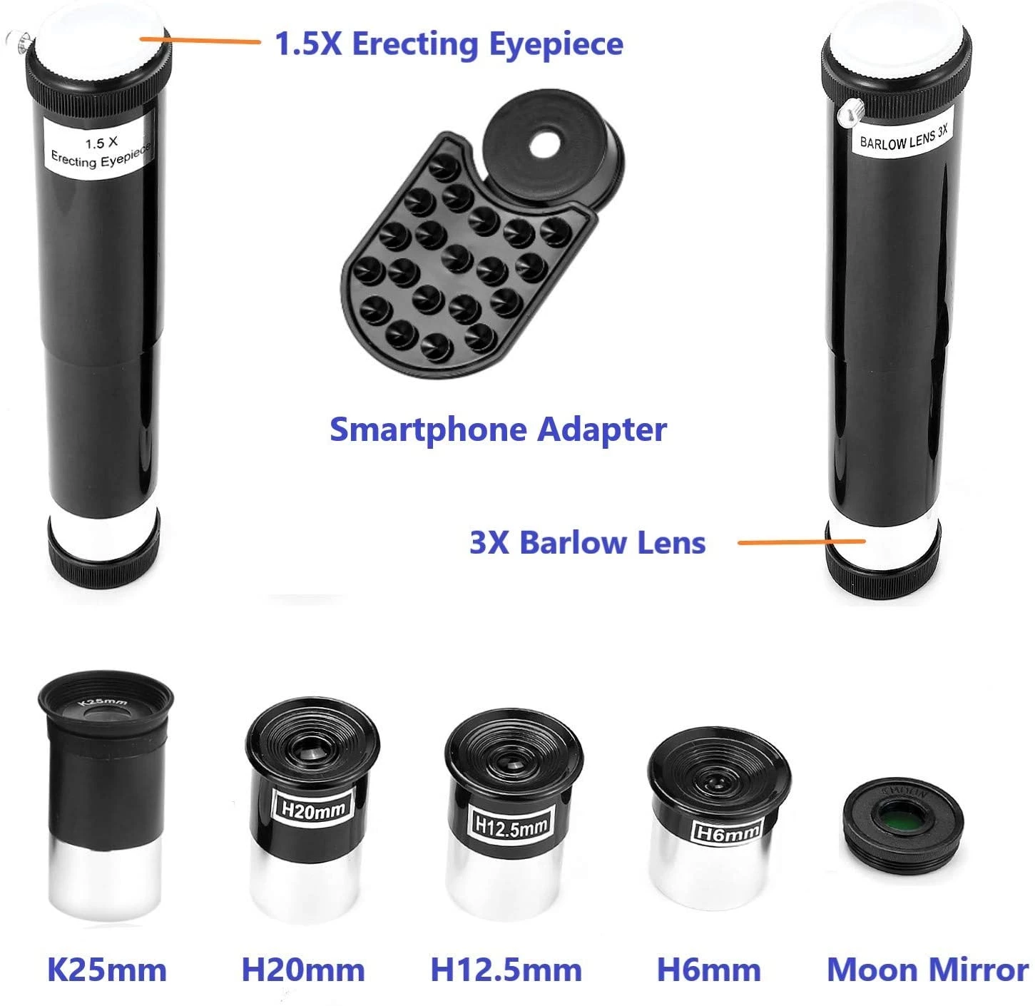 Включає окуляри H6mm, H12.5mm, H20mm і K25mm, всього 4 шт. Високе збільшення (H6mm), середнє збільшення (H12.5mm) і низьке збільшення, але з більш чітким зображенням (H20mm & K25mm) окуляри дають вам різноманітність для будь-якої ситуації перегляду.