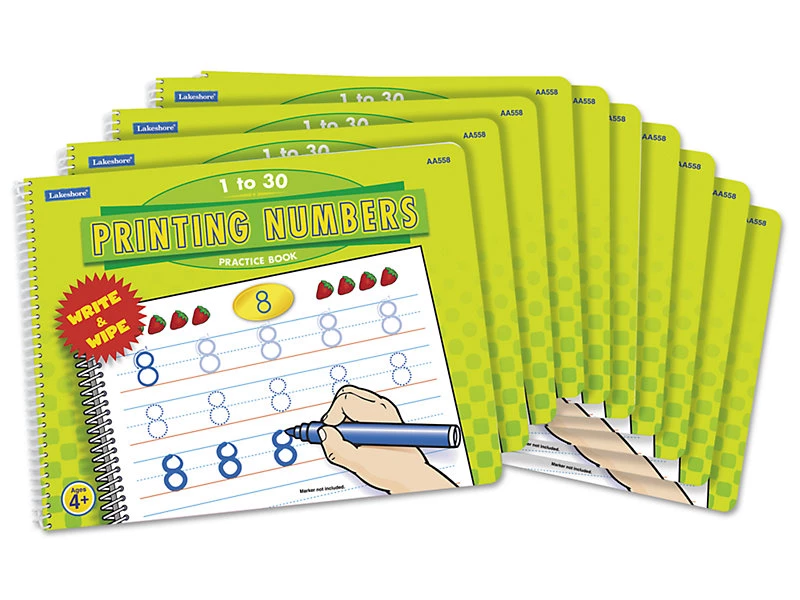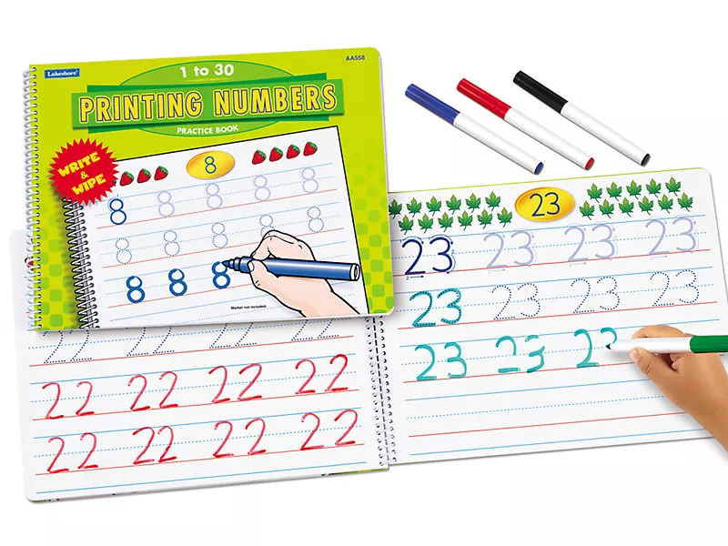 З цим прописом, діти тренуються писати числа від 1 до 30. Зошит можна використовувати для навчання знову і знову, стираючи вже написане. Кожна сторінка фокусується на окремому числі. Для зручності, на початку стрілками показано як правильно писати кожне число. На наступному рядку пунктиром показано як писати число і дитина повинна обвести його, а далі - вже потрібно самостійно написати число. Таким чином, дитина поступово запам'ятовує і вчить цифри, а також їх правильне написання.