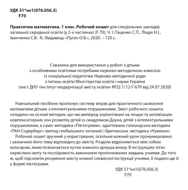 Робочий зошит призначається для використання в спеціальних навчальних закладах, орієнтованих на дітей з інтелектуальними порушеннями і синдромом Дауна. У ньому використовується методика "Піктограми" і "Нумікон", а також метод глобального читання "ТАН-Содерберг". З її допомогою можна повторити матеріал, пройдений в першому класі, а також вивчити нумерацію, додавання і віднімання в межах 20. Завдання спрямовані на розвиток аналітичних навичок, порівняння, узагальнення, вилучення зайвого і багато чого іншого.