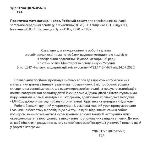 Робочий зошит з математики призначена для використання в навчальних закладах, спеціалізованих для дітей з синдромом Дауна та інтелектуальними порушеннями. Він включає в себе безліч унікальних методик: "Нумікон", "Піктограми" і метод глобального читання "ТАН-Содерберг". Зошит призначений для повторення пройденого в першому класі матеріалу, вивчення нумерації, вирахування і складання в межах 20. Завдання орієнтовані на розвиток аналітичних здібностей, узагальнення, вилучення зайвого і багато чого іншого.