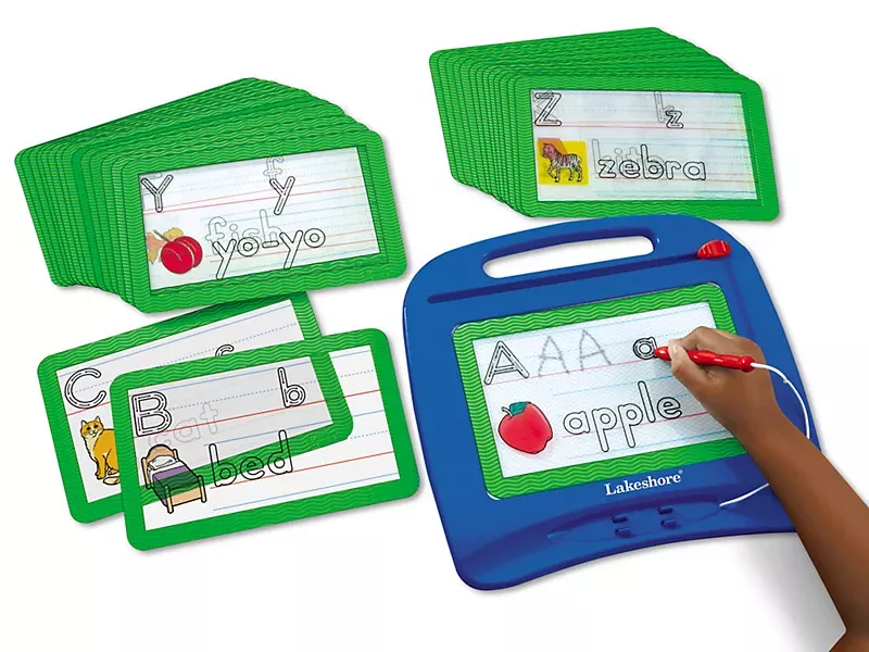 З навчальними картками від компанії Lakeshore навички письма покращуються, як за помахом чарівної палички! Просто помістіть картку на дошку Magic Board (продається окремо), і ваша дитина почне обводити заздалегідь надруковані літери. Крім того, зручні базові лінії дозволять дітям практикуватись у письмі самостійно. Є навіть просте слово, яке дозволяє закріпити звуки букв. У набір входить 30 карток: по 1 на кожну букву та 4 з усім алфавітом.