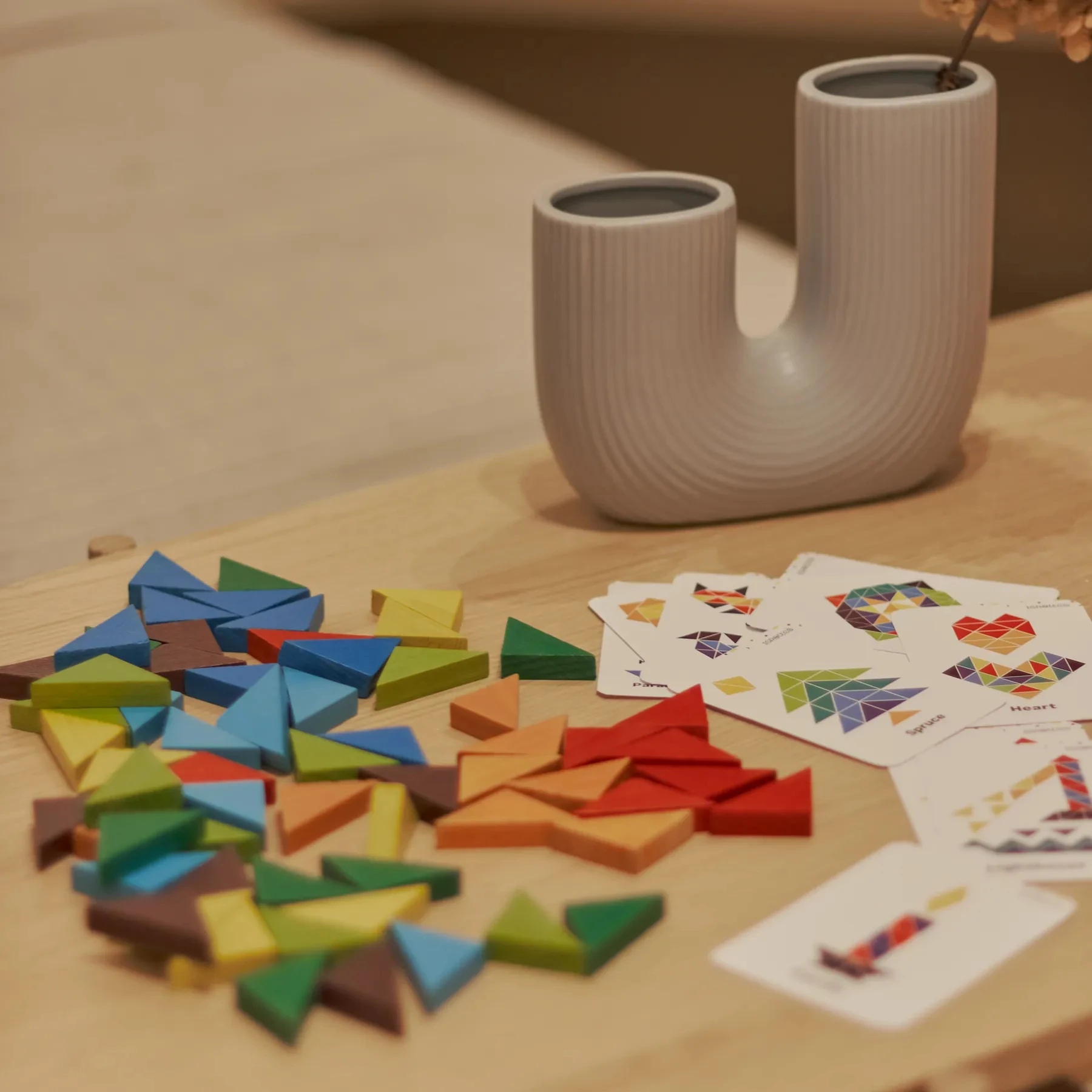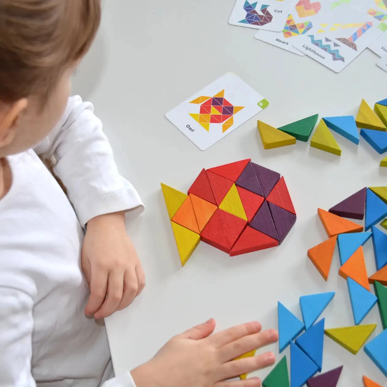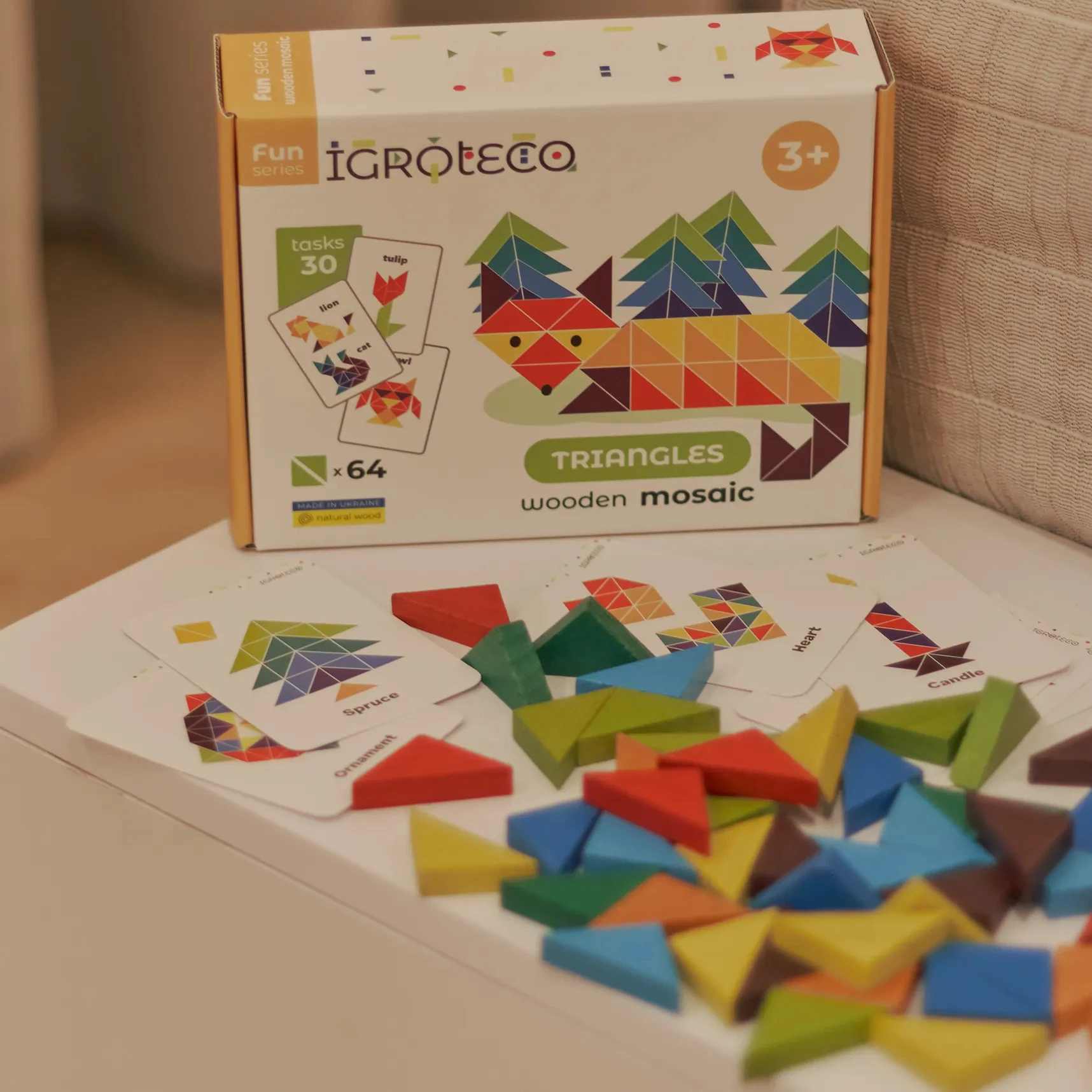 Різнокольорові деталі мозаїки мають трикутну форму. З їх допомогою дитина зможе скласти стилізовані зображення рослин, тварин, предметів побуту та багато іншого. Крім різнокольорових елементів, у наборі є 10 кольорових карток з прикладами цікавих фігур.