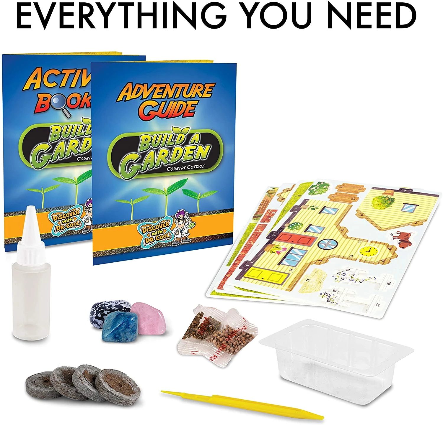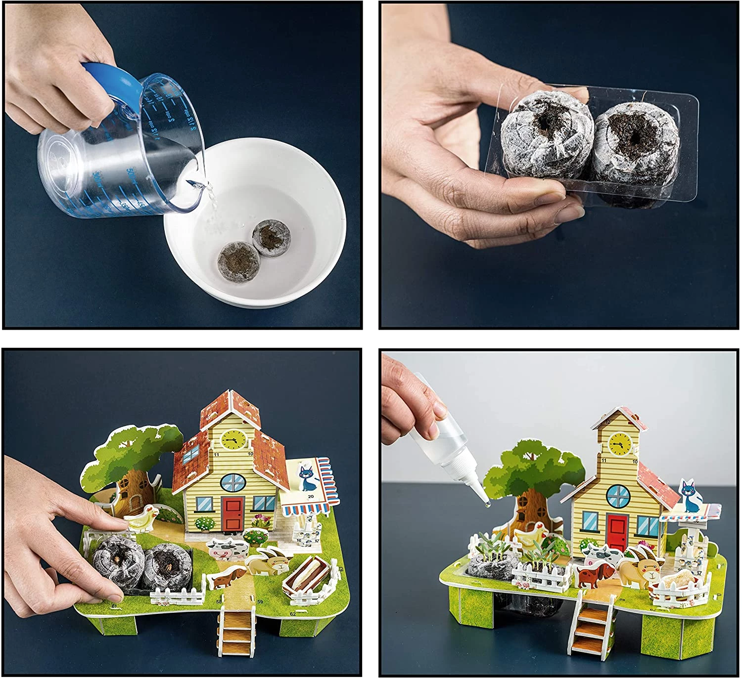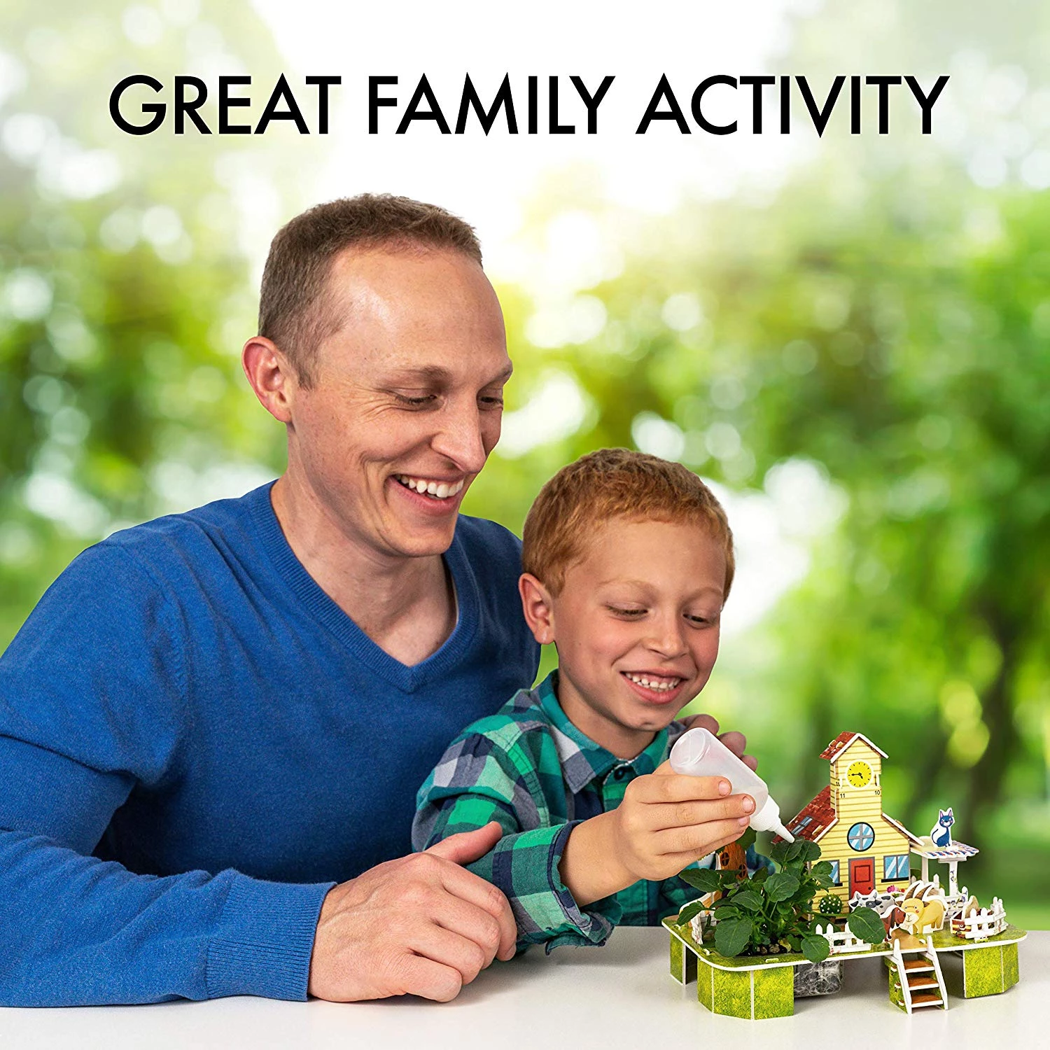 Побудувати заміський міні котедж і виростити свій власний міні сад дитина зможе самостійно за допомогою цього набору. Спочатку побудуйте будиночок зі шматочків, потім посадіть редьку і насіння фіалки в гранули з торфу і спостерігайте, як росте ваш садок!