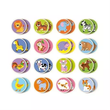 Яскраві кольори і милі картинки з тваринами сподобаються всім малюкам. У наборі 32 картки по 16 видів тварин в двох примірниках. Можна придумувати різні варіанти ігор. Розкласти спочатку картки картинками вгору, дитина повинна подивитися і запам'ятати де які картинки. Потім потрібно перевернути картки і дитина повинна правильно вгадати пари.