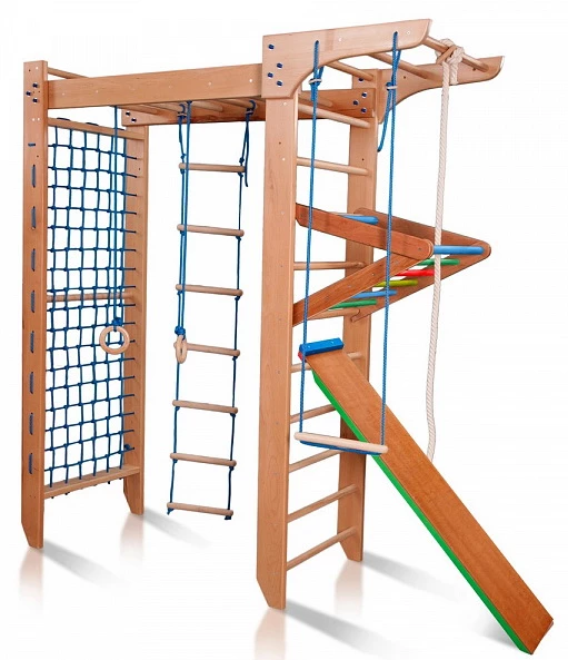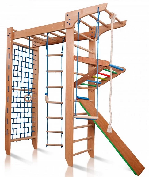 Гімнастичні кільця, мотузкові сходи, канат, трапеція і навіть дошка для преса - все це об'єднує в собі ця компактна спортивна установка! Виконана з бука, вона стане справжнім міні-спортзалом і для дітей, і для дорослих! А завдяки своїй П-образній формі і дизайну, такий дитячий куточок ідеально впишеться в будь-який інтер'єр будь-якого будинку - будь то звичайна квартира або заміський будинок з високими стелями! Дайте дитині можливість розвивати свої фізичні навички і будьте спокійні за його здоров'я і настрій!