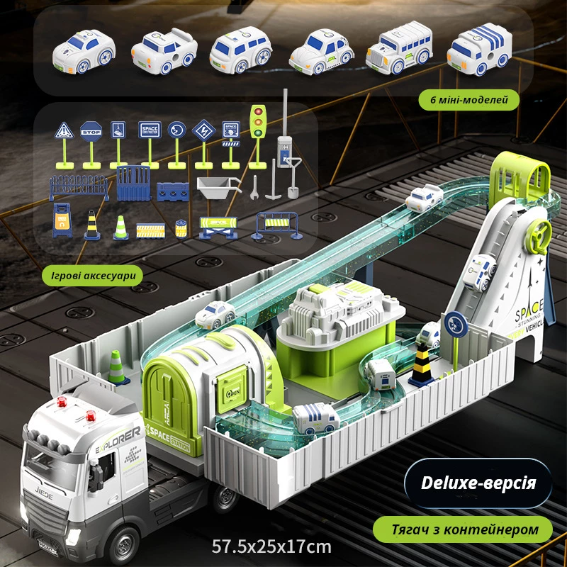 Даний набір включає великий тягач з кузовом, в якому знаходиться трек, 6 міні-моделей і комплект всіляких дорожніх знаків. Гоночний трек у вигляді замкнутого кільця гарантує захоплюючі ігри з машинками. Одна з частин треку є спіральною трасою.