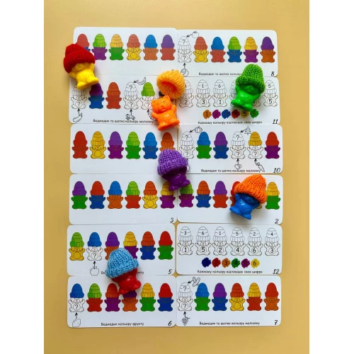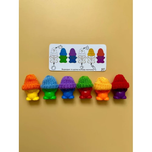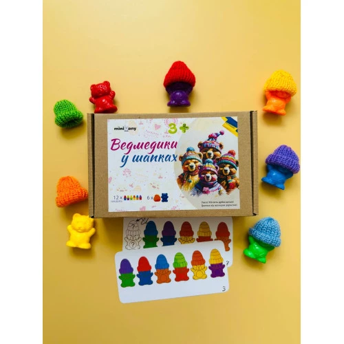 Цей набір для сортування, що включає 6 різнокольорових ведмедиків і шапочок, — корисний подарунок для дітей віком від 3 років і старше. Найпростіше завдання для дитини — знайти шапочку, яка підходить за кольором, і одягти її на голову ведмедику. У наборі є картки та інші складніші завдання. Усього 12 завдань.
