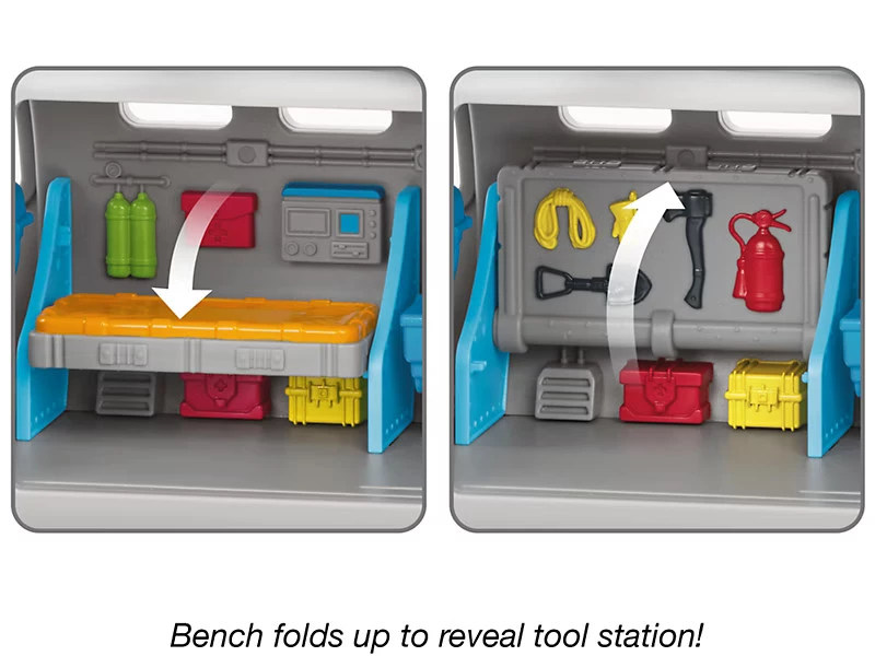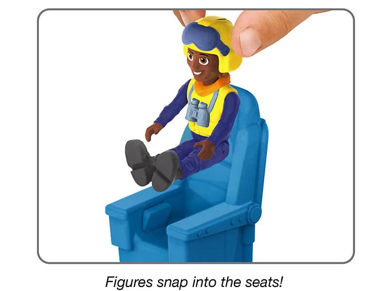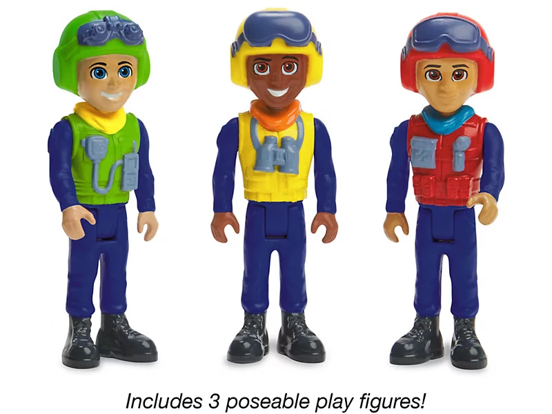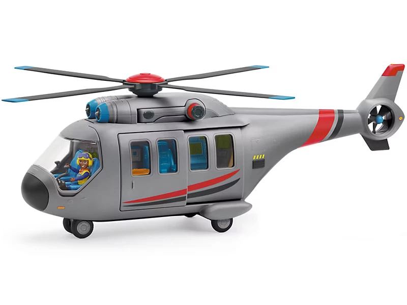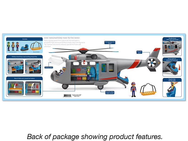 Дитяча уява злітає у небо! Завдяки ігровим майданчикам від кабіни до хвоста наш вертоліт готовий до великих пригод! Діти гратимуть з рухомими фігурками пілотів, стежитимуть за приладами на борту, керуватимуть судном та багато іншого. Крім того, вертоліт має лопаті, що обертаються, і двері, за якими ховається командний центр, складана лава і інструментальна станція. Є навіть робоча лебідка, щоб піднімати та опускати кошик для рятувальних операцій.
