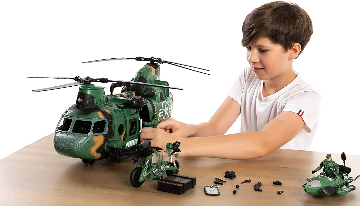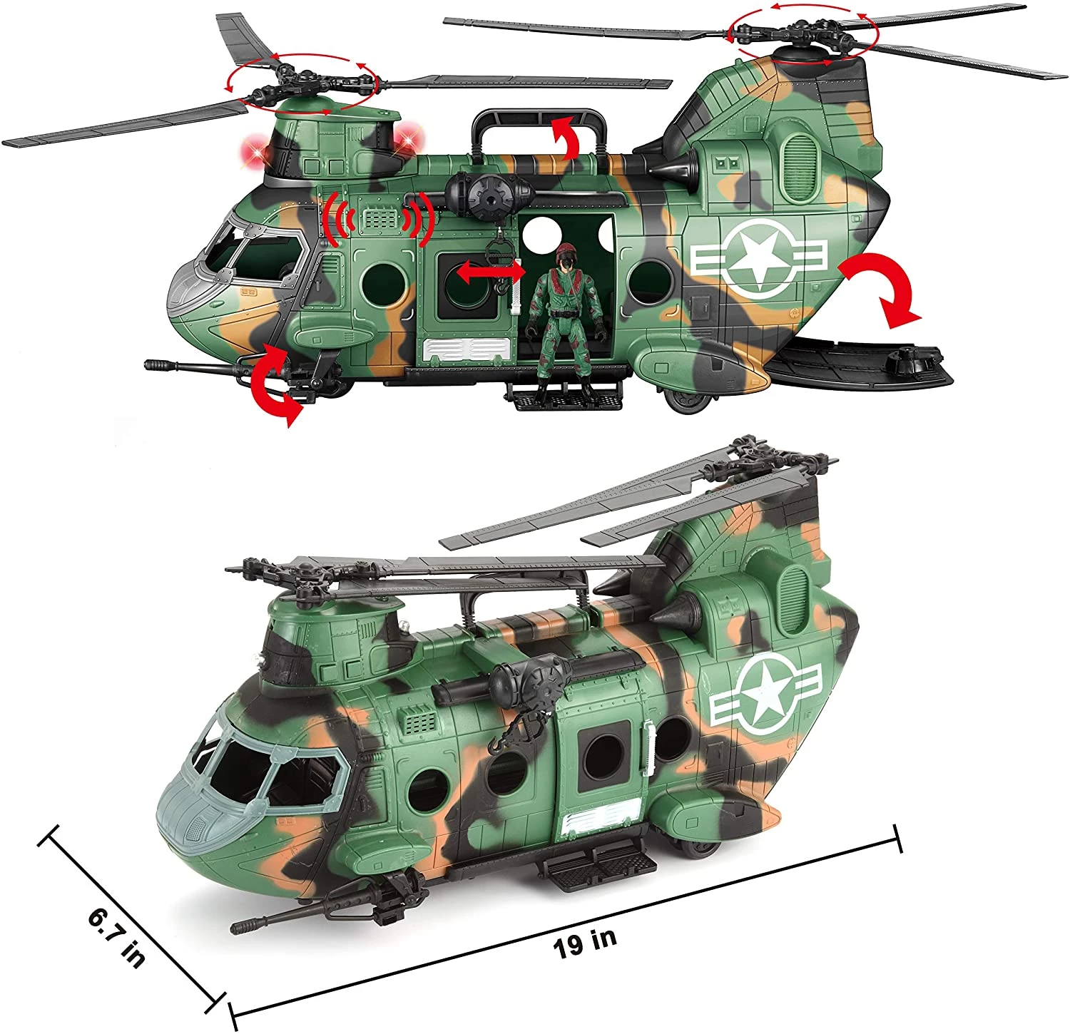 Транспортний вертоліт може завантажувати військові машини і фігурки солдатів. Вертоліт має реалістичний світ і звук, а також безліч рухомих частин.