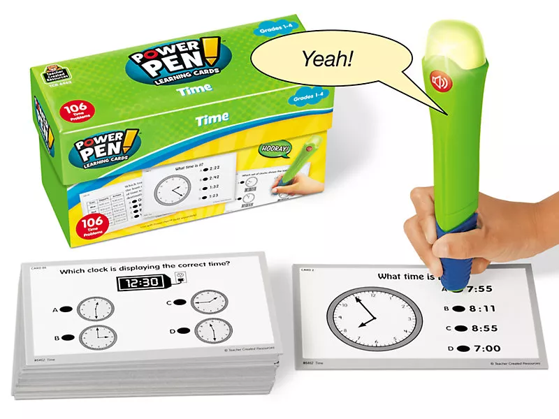 Цікавий спосіб вивчити час і часові рамки в ігровій формі. Діти вибирають картку, читають питання і вибирають правильну відповідь. Потрібно торкнуться обраної відповіді спеціальною ручкою, і ручка скаже їм - праві вони чи ні. У наборі 53 двосторонніх карти і ключ відповідь.