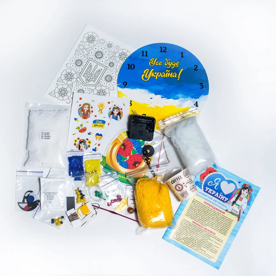 Використовуючи матеріали, що входять до комплекту, можна створити 8 аксесуарів та виробів у патріотичному стилі. У наборі є покрокова інструкція з ілюстраціями. Готові вироби - чудові сувеніри для рідних та друзів!
