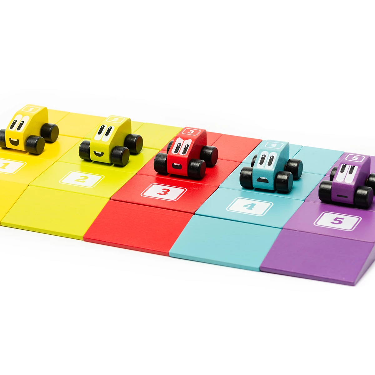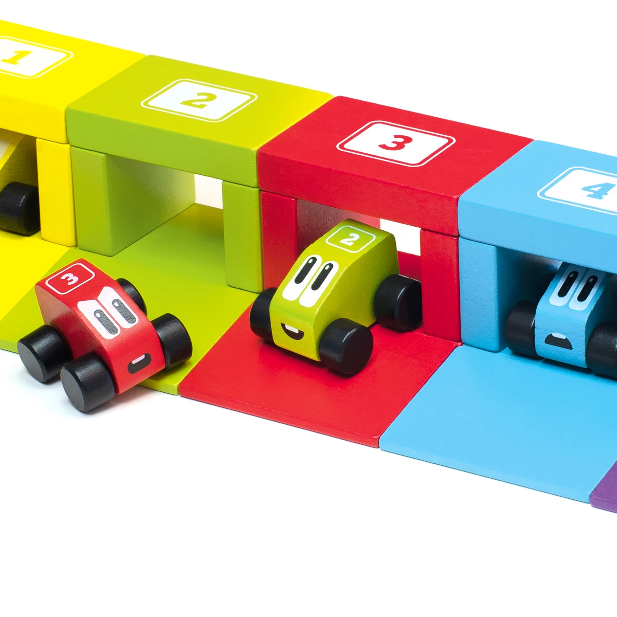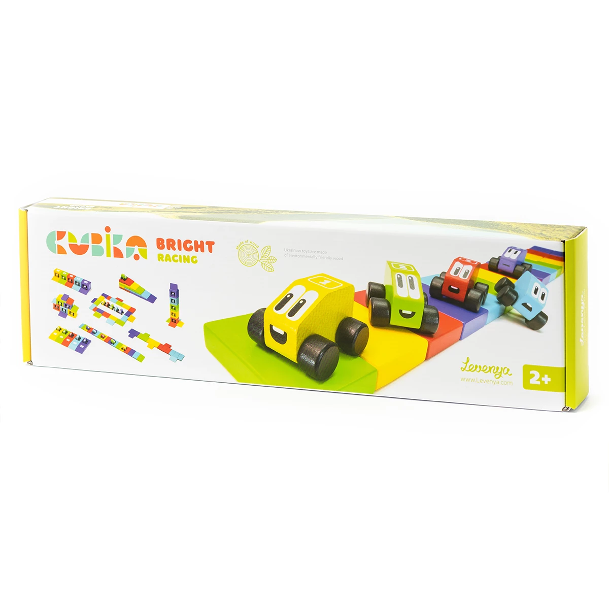 Розвивальна екологічна дерев'яна іграшка «Яскраві гонки» є різнокольоровим дерев'яним набором з машинками для захопливих рольових ігор. Кожна машинка має власний номер, також у наборі є гаражі з відповідними номерами. Ця іграшка допомагає дитині вивчати різні кольори, емоції, фігури та форми. Під час гри дитина зможе навчитися рахувати та розширити свій словниковий запас. Набір розвиває моторику, координацію рухів та інші важливі навички.