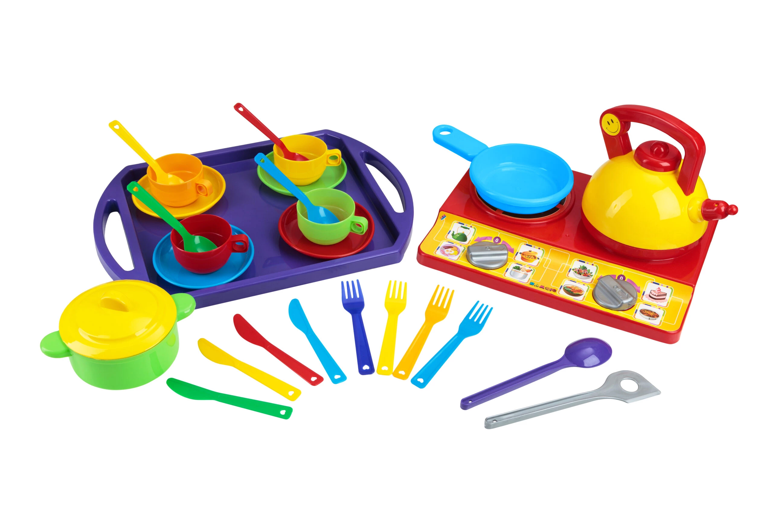 Поринай у світ кулінарії з цим чудовим набором посуду та кухонного начиння! Тут є все необхідне для приготування кулінарних шедеврів: каструля з кришкою, сковорода, чайник, чашки, тарілки, ложки та інші предмети, без яких на кухні не обійтися — всього 28 елементів. Є навіть іграшкова плита з ручками, що обертаються.