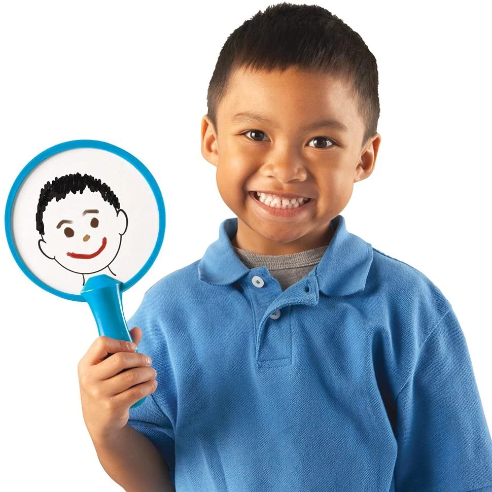 Прекрасні дзеркала, на яких можна малювати емоції. На кожному дзеркалі намальований контур обличчя, який полегшить роботу і дасть можливість дитині проявити фантазію знову і знову, так як з цього дзеркала можна легко стерти свою творчість. Міцна якість. Дзеркала абсолютно безпечні і не б'ються. Зручна ручка передбачена так, щоб її було легко тримати в маленькій руці. Добре розвиває уяву логіку, дрібну моторику, навички малювання і просто допомагає дитині показати, які емоції він відчуває в даний момент.