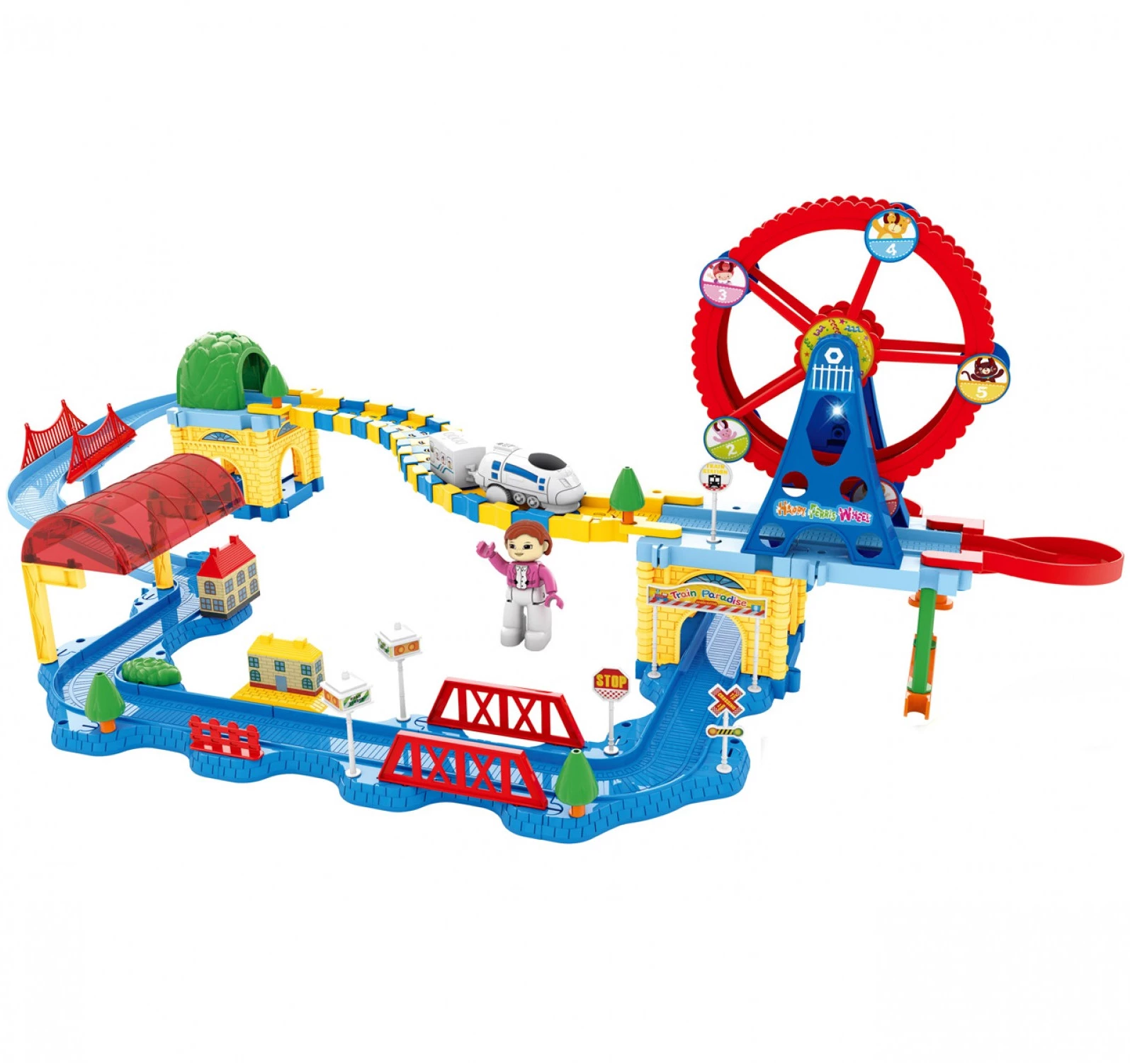Завдяки цьому ігровому набору дитина зможе самостійно збудувати залізницю. Конструктор включає 82 деталі, що дозволяють швидко спорудити дорогу і пограти з барвистими персонажами і різними спорудами. Елементи набору мають різну форму та довжину. У комплекті є не тільки деталі для збирання залізничного полотна, а й локомотив, станція, тунель та атракціон. Також у набір входить пара фігурок робітників. Локомотив оснащений мотором, тому може самостійно пересуватися рейками вперед і назад (потрібні 3 батарейки AAA).
