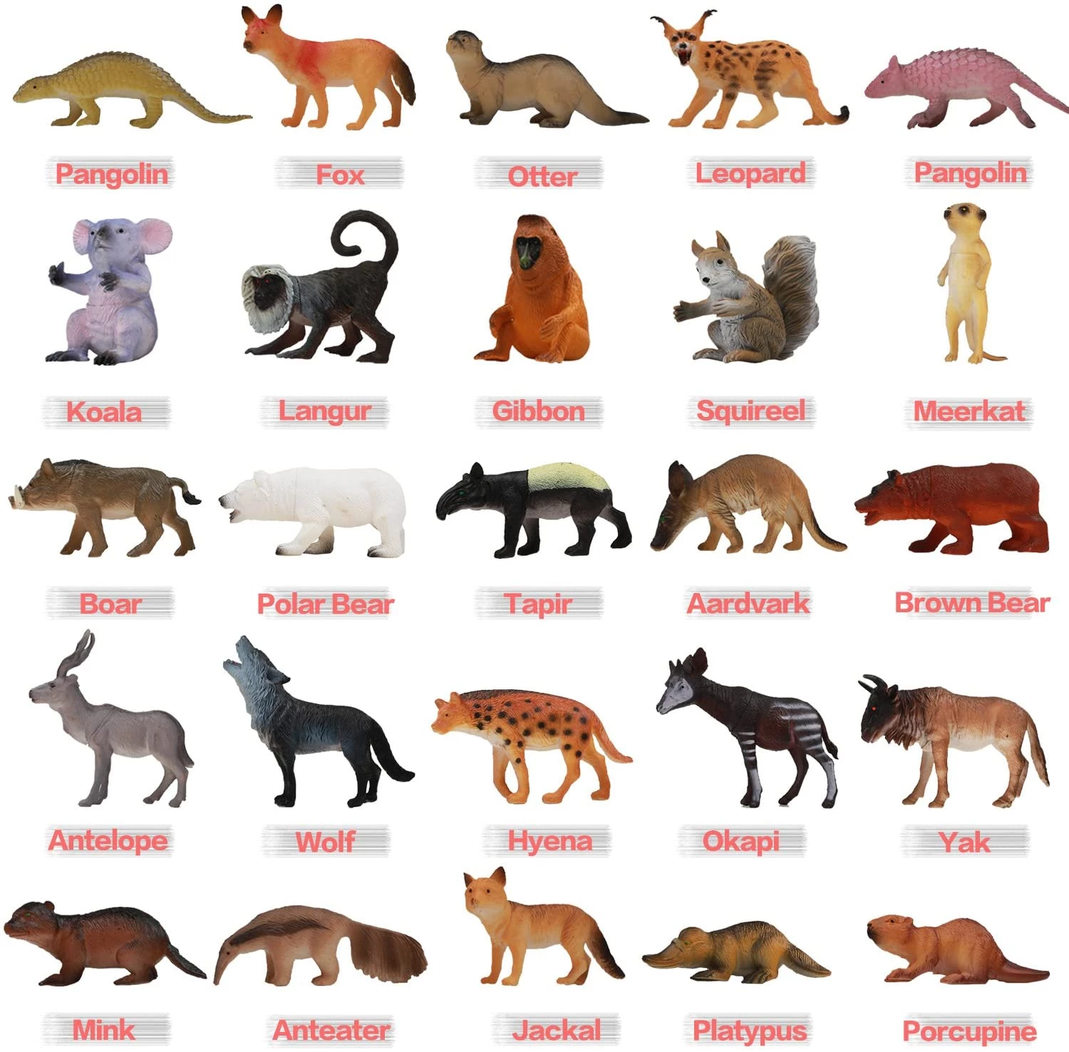 У наборі 25 реалістичних тварин висотою 10 см. Деякі тварини з набору: вовк, мавпа, шакал, сурікат, окапі, лисиця, ведмідь, окапі, норка та інші. Кожна фігурка тварини була індивідуально розписана вручну.