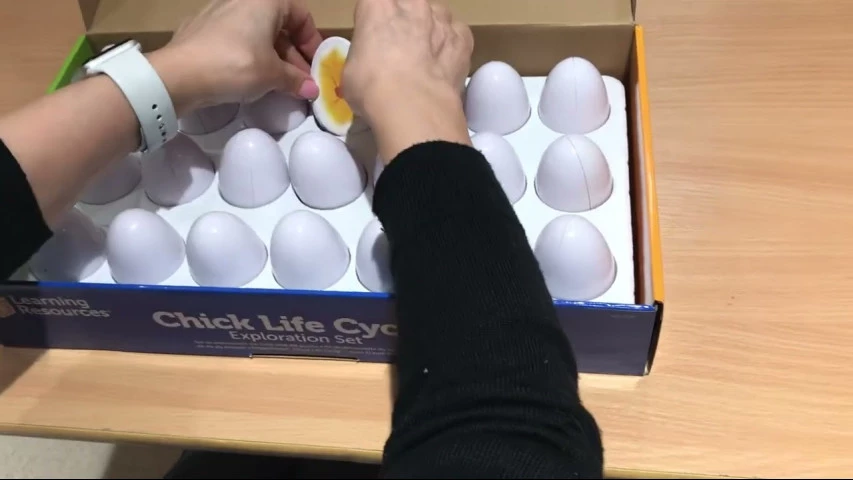 Набір яєць, який наочно показує приклад того як зароджується курча, його розвиток в яйці до самого народження. У наборі є 21 яйце, поділене на дві частини. У кожному яйці показаний період розвитку зародка курчати до самого його вилуплення з яйця. Цей набір яєць прекрасний засіб для вивчення та розвитку. Реалістичність кожної ілюстрації вразить навіть дорослого. У наборі є зручний лоток для зберігання яєць.