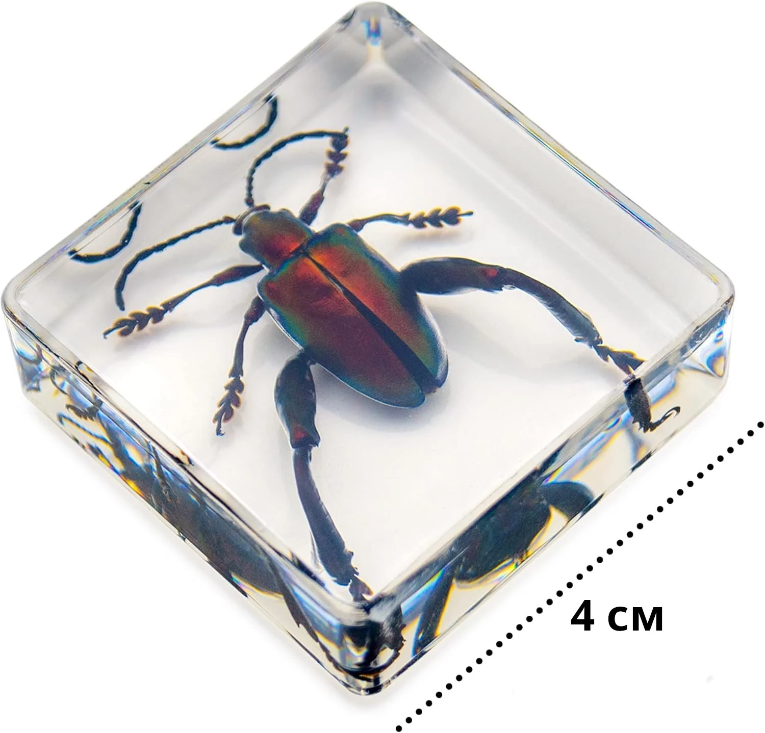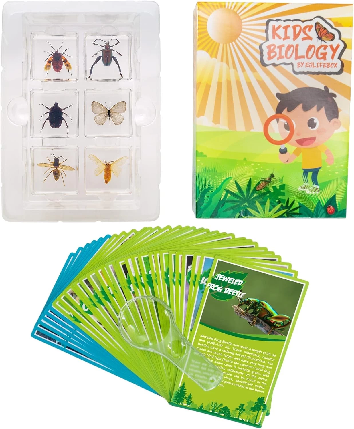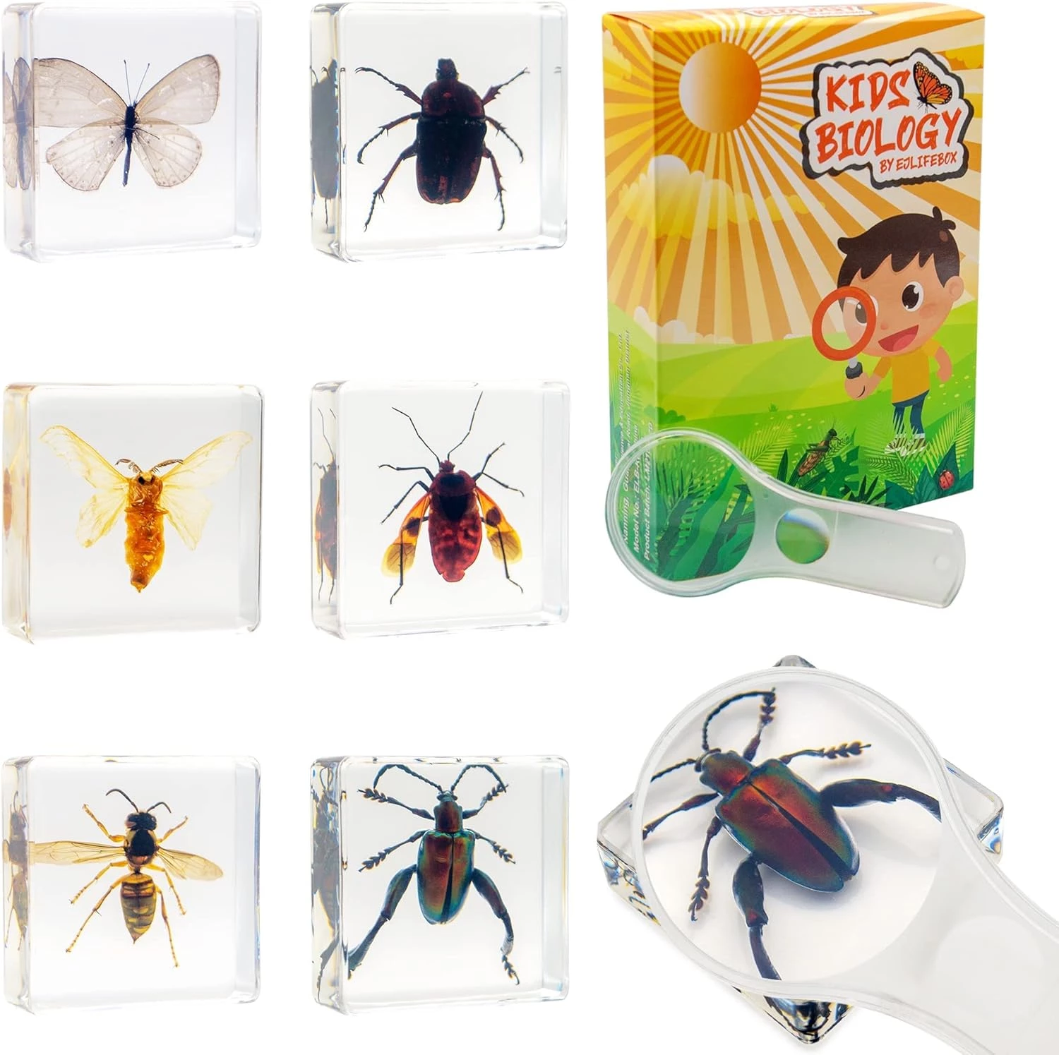 Даний набір - чудовий подарунок для маленьких вчених, а також для дорослих, які захоплюються ентомологією. Він включає 6 комах, укладених в блоки з акрилової смоли Lucite. Усі комахи справжні! У комплект входять такі екземпляри: метелик, жужелиця, шовкопряд, хрущ, клоп-смердючка, оса. Це найнаочніший для дітей спосіб ближче познайомитися з найпоширенішими комахами. Крім зразків комах до набору входять лупа та комплект ознайомлювальних карток.