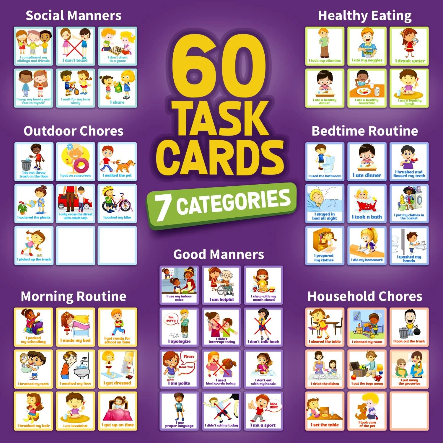 Цей журнал включає щотижневі таблиці нагород та наклейки, які прослужать весь рік. Також у набір входить 60 карток із завданнями, тому ви і ваша дитина можете налаштувати ваш журнал, щоб відобразити 7 завдань, які відповідають вашому способу життя та потребам. Картки із завданнями можна міняти місцями, так що ви можете вводити нові завдання за необхідності. Комплект включає зручну систему зберігання карток, щоб картки із завданнями не губилися!