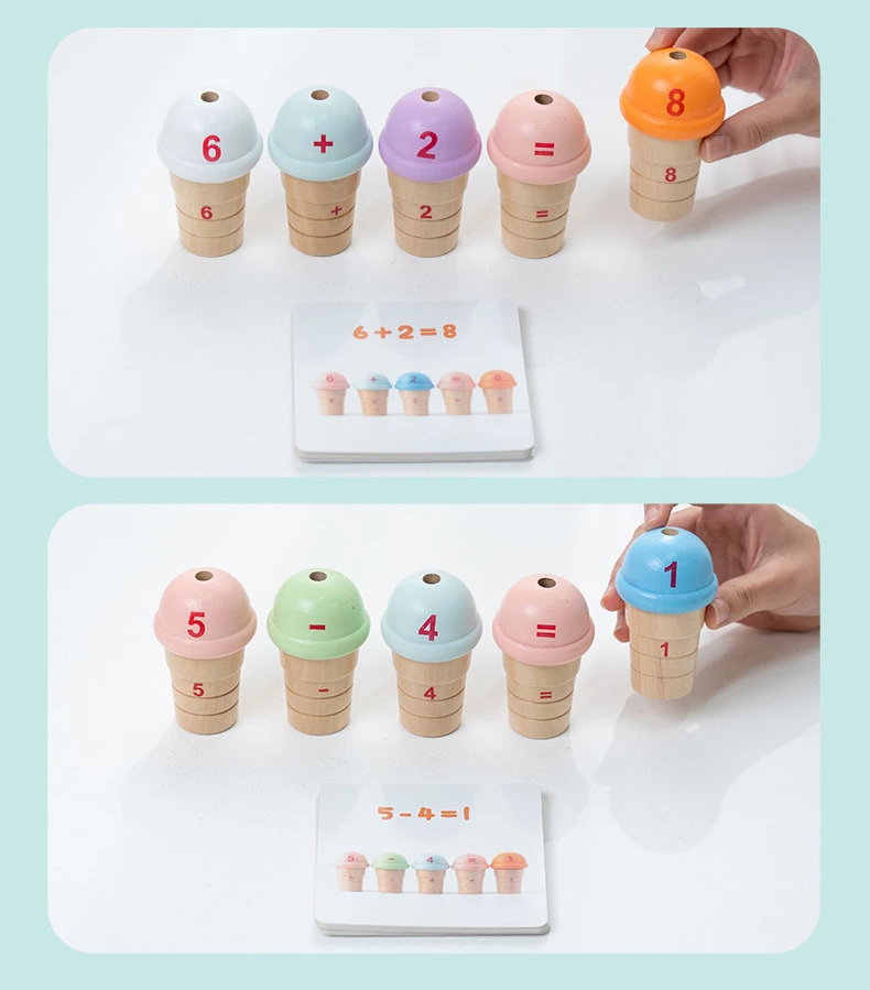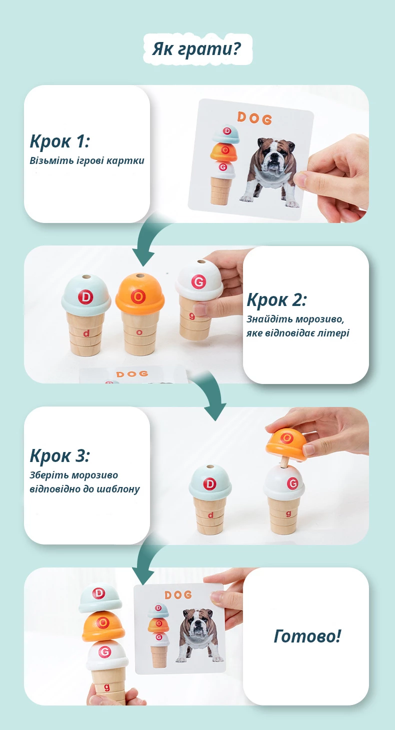 На крышечках мороженого нарисованы буквы английского алфавита (26 прописных и строчных букв, всего 52 штуки), а также цифры и математические символы. В набор входят карточки с заданиями. На одной стороне карточек изображено слово, которое нужно собрать, используя крышечки мороженого с буквами, а на обратной — арифметические примеры, которые нужно решить, используя крышечки с цифрами и математическими символами. Всего в комплект включено 10 карточек.