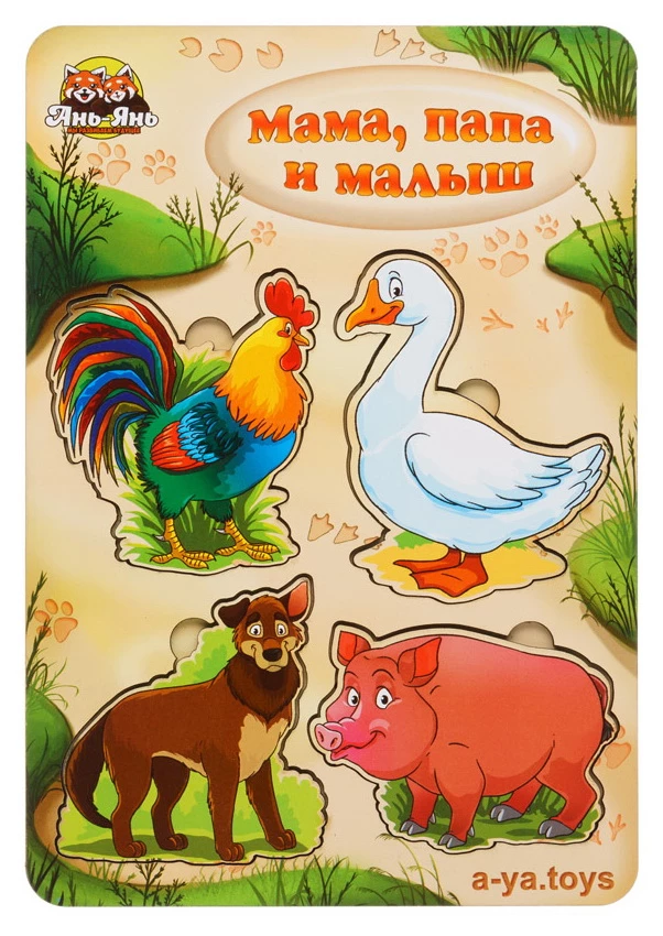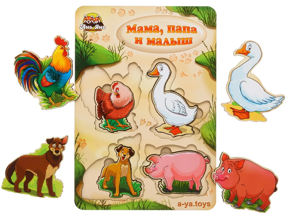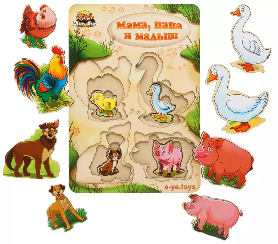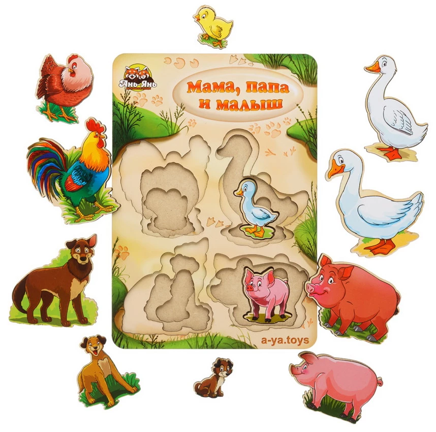 С данной игрой очень просто объяснить ребенку, что в мире животных также существуют семьи. В набор входит 4 вида: свиньи, утки, собаки, курицы. В каждом виде по три представителя: мама, папа и малыш.