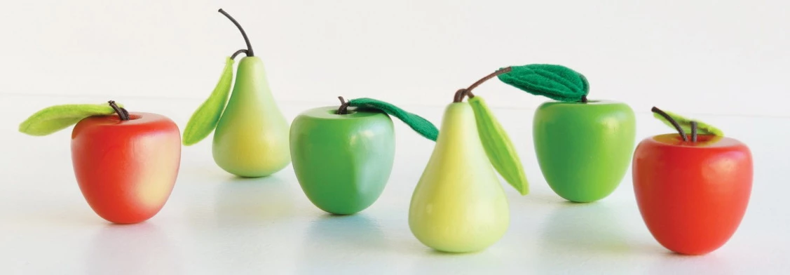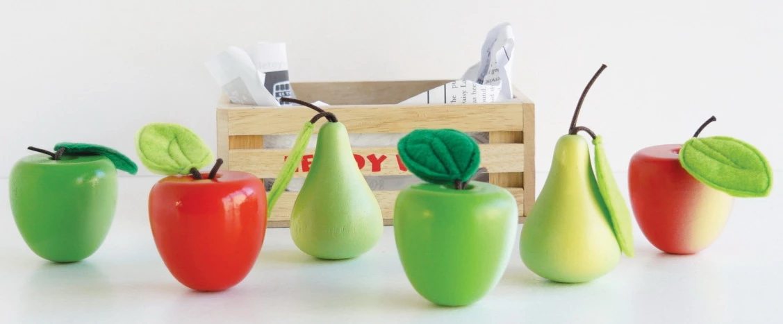Покупайте и продавайте фрукты как на настоящем рынке или в магазине. В набор входят две зеленые груши, два красных яблока и два зеленых. Фрукты с войлочными листочками, украшены вышивкой. Плоды изготовлены из экологически чистого каучукового дерева. Воссоздана естественная форма фруктов. Набор развивает тактильную память, зрительную, развивать образное мышление.
