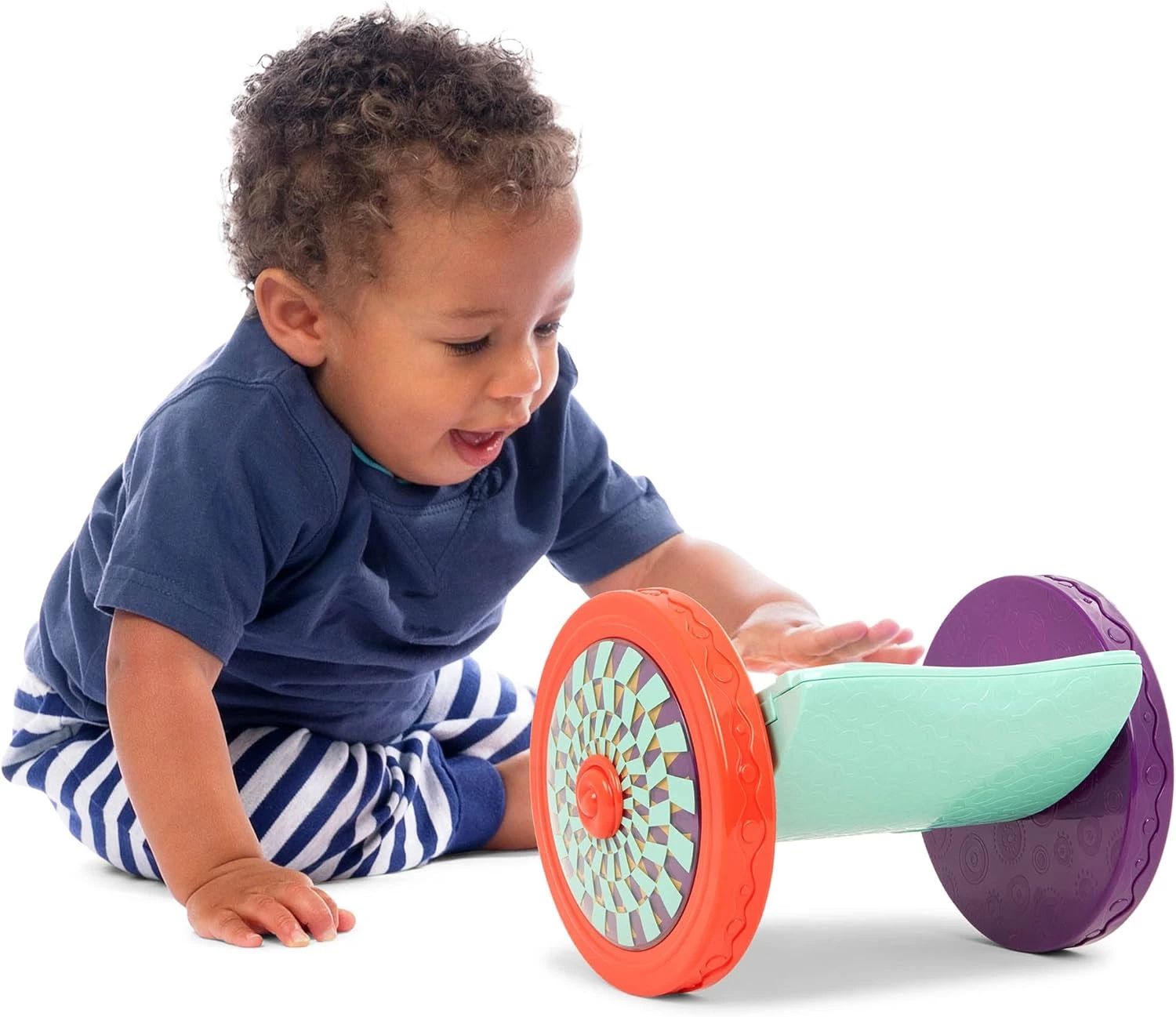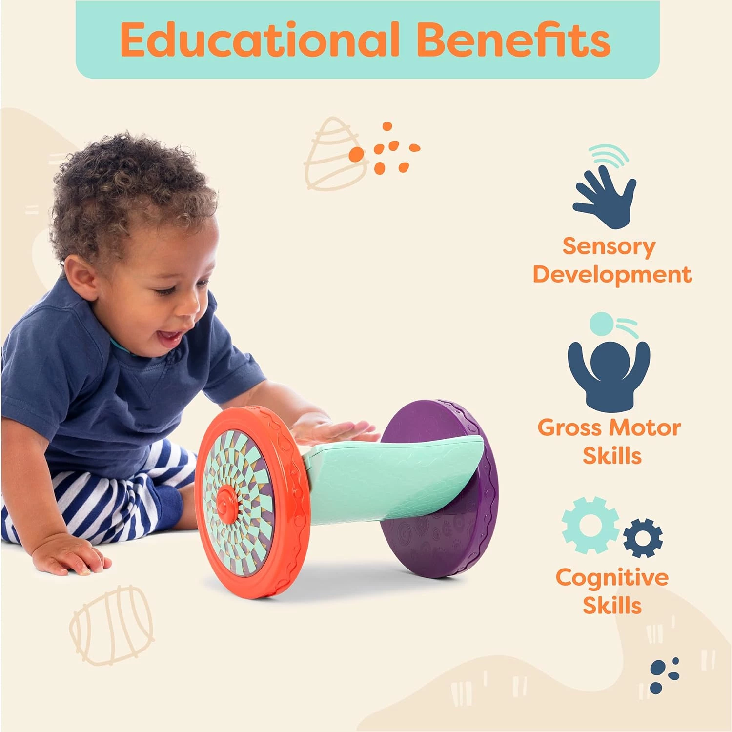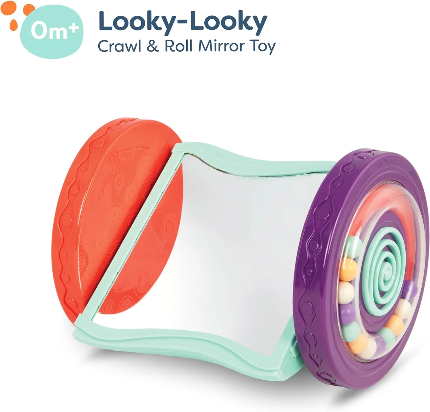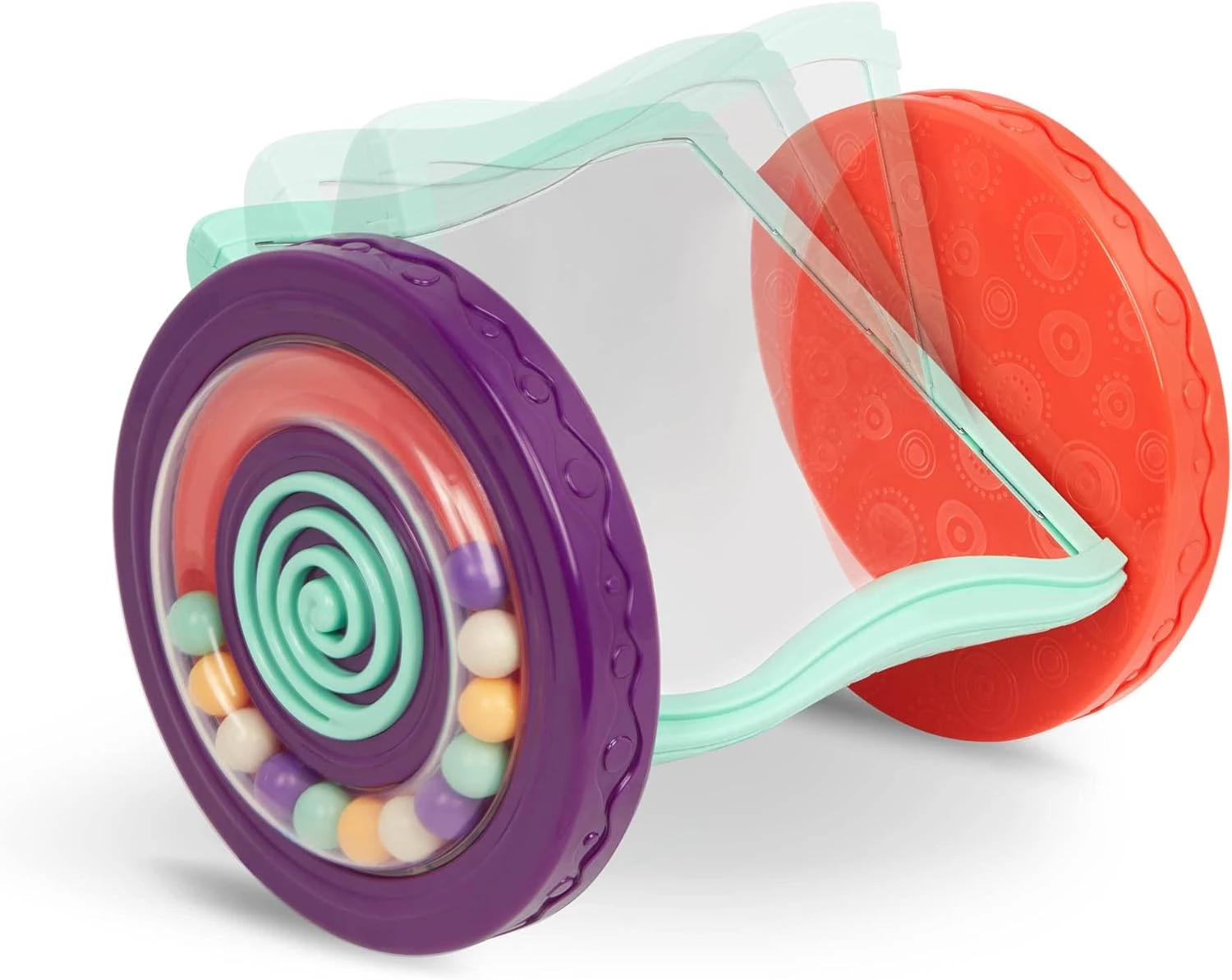 Катайтесь, ползайте и развлекайтесь с этой замечательной игрушкой, оснащенной вращающимся зеркалом. Она создана специально для любознательных малышей, которым не терпится посмотреть на свои милые мордашки. Но это не все! Помимо того, что малыши могут наслаждаться этой игрушкой во время отдыха на животике, они также могут толкать, ползать и гоняться за катящейся игрушкой, чтобы оставаться активными. Зеркало всегда будет пребывать в вертикальном положении, благодаря двум массивным, ярким и прочным колесам. В одном из колесиков есть шарики, гремящие во время движения, а другое поражает завораживающим спиральным дизайном и звонкими звуками — отличный выбор для сенсорного развития ребенка! Не говоря уже о том, что игра с этим развивающим центром также может стимулировать самопознание и улучшить мелкую моторику.