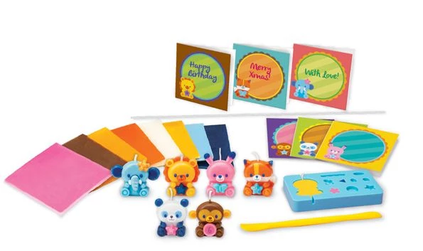 Этот творческий набор поможет детям создать мини свечки в виде милых животных. Нужно размягчить восковые пластины из набора с помощью фена. Используя шаблон, можно сделать милые свечки, которые потом подарить друзьям или родным. В наборе есть пустые цветные открытки к разным праздникам, которые можно заполнить и подарить вместе со свечками.