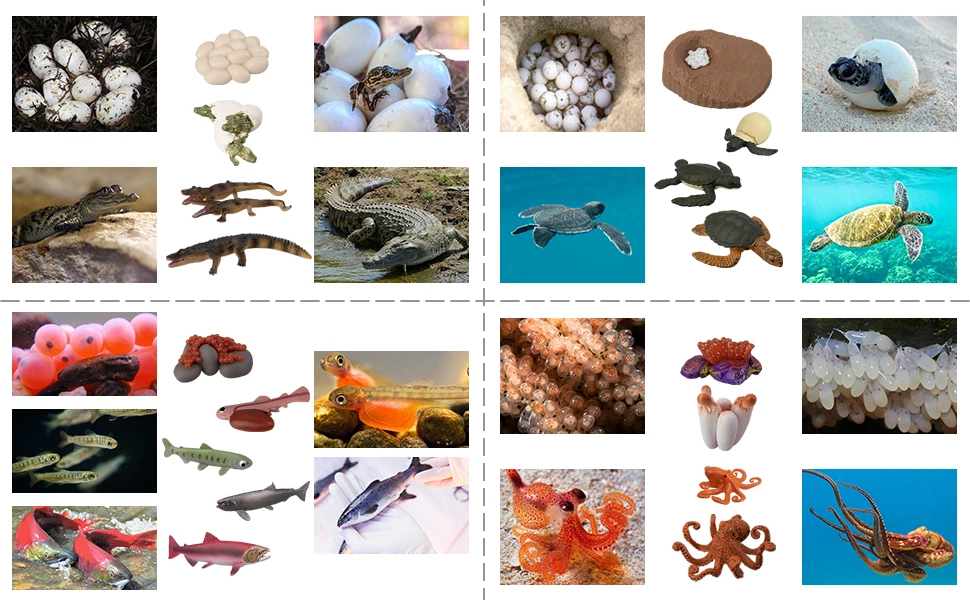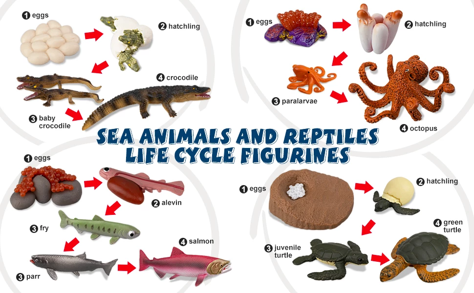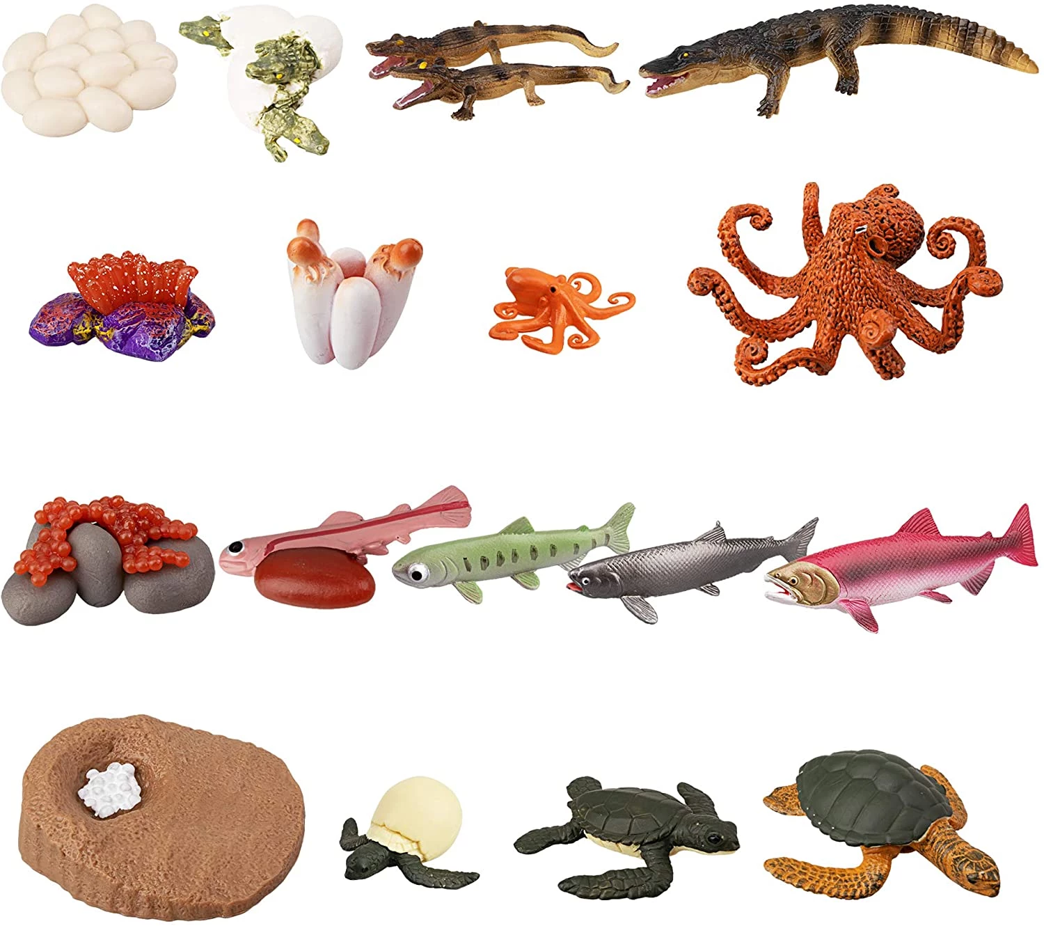 Очень интересный набор наглядно демонстрирует жизненные циклы крокодила, осьминога, черепахи и лосося. Каждый их них состоит из 4-х или 5-ти этапов развития от яйца, икринки до взрослой особи. Фигурки очень реалистичные и детально прорисованы все особенности. Таким набором можно украсить домашний террариум или использовать как наглядный материал во время изучения жизненных циклов различных живых организмов. Игрушки качественные и окрашены безопасной гипоаллергенной краской.
